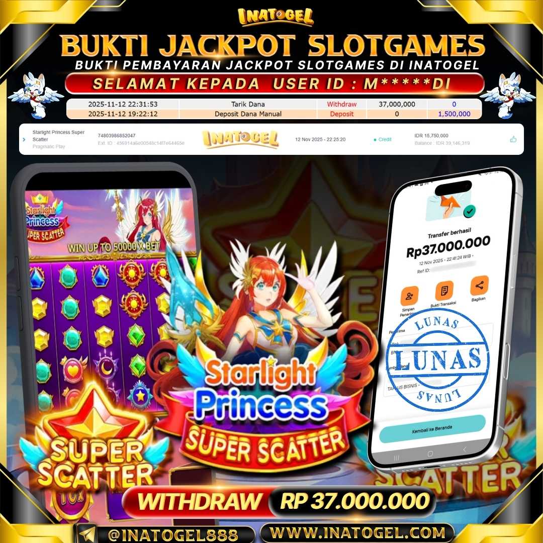 Selamat kepada User Id M****DI telah berhasil mendapatkan kemenangan jackpot pada permainan SlotGame Starlight Princess Super Scatter sebesar Rp37,000,000,- . Inatogel situs terpercaya sejak dulu hingga saat ini , Untuk kemenangan berapapun pasti akan kami bayarkan . Jangan ragu bermain di Ina Togel . Kami pihak Inatogel Menyampaikan terima kasih kepada seluruh member Ina Togel yang telah Percaya dan setia Bersama kami bermain di Inatogel saat ini.