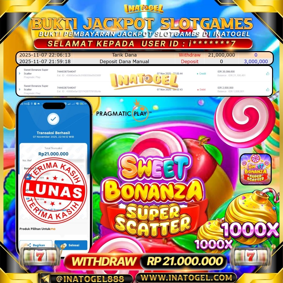 Selamat kepada User Id i*******7 telah berhasil mendapatkan kemenangan jackpot pada permainan SlotGame Sweet Bonanza Super Scatter sebesar Rp21,000,000,- . Inatogel situs terpercaya sejak dulu hingga saat ini , Untuk kemenangan berapapun pasti akan kami bayarkan . Jangan ragu bermain di Ina Togel . Kami pihak Inatogel Menyampaikan terima kasih kepada seluruh member Ina Togel yang telah Percaya dan setia Bersama kami bermain di Inatogel saat ini.