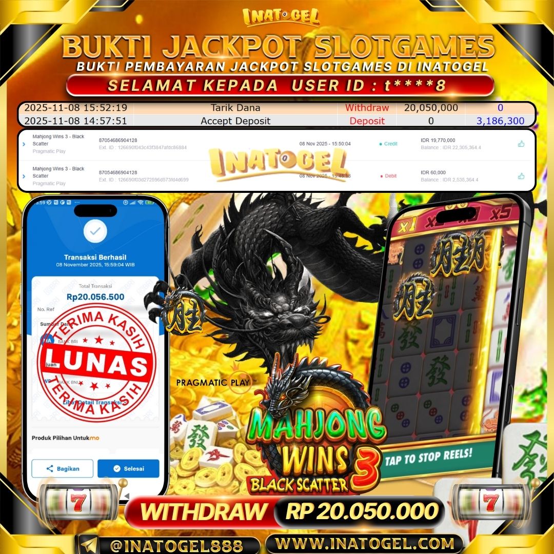Selamat kepada User Id t****8 telah berhasil mendapatkan kemenangan jackpot pada permainan SlotGame Mahjong Wins 3 - Black Scatter sebesar Rp20,050,000,- . Inatogel situs terpercaya sejak dulu hingga saat ini , Untuk kemenangan berapapun pasti akan kami bayarkan . Jangan ragu bermain di Ina Togel . Kami pihak Inatogel Menyampaikan terima kasih kepada seluruh member Ina Togel yang telah Percaya dan setia Bersama kami bermain di Inatogel saat ini.