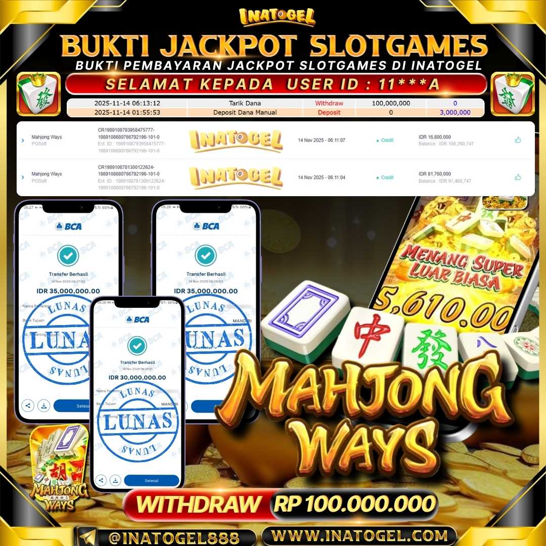 Selamat kepada User Id 11***A telah berhasil mendapatkan kemenangan jackpot pada permainan SlotGame Mahjong Ways sebesar Rp100,000,000,- . Inatogel situs terpercaya sejak dulu hingga saat ini , Untuk kemenangan berapapun pasti akan kami bayarkan . Jangan ragu bermain di Ina Togel . Kami pihak Inatogel Menyampaikan terima kasih kepada seluruh member Ina Togel yang telah Percaya dan setia Bersama kami bermain di Inatogel saat ini.