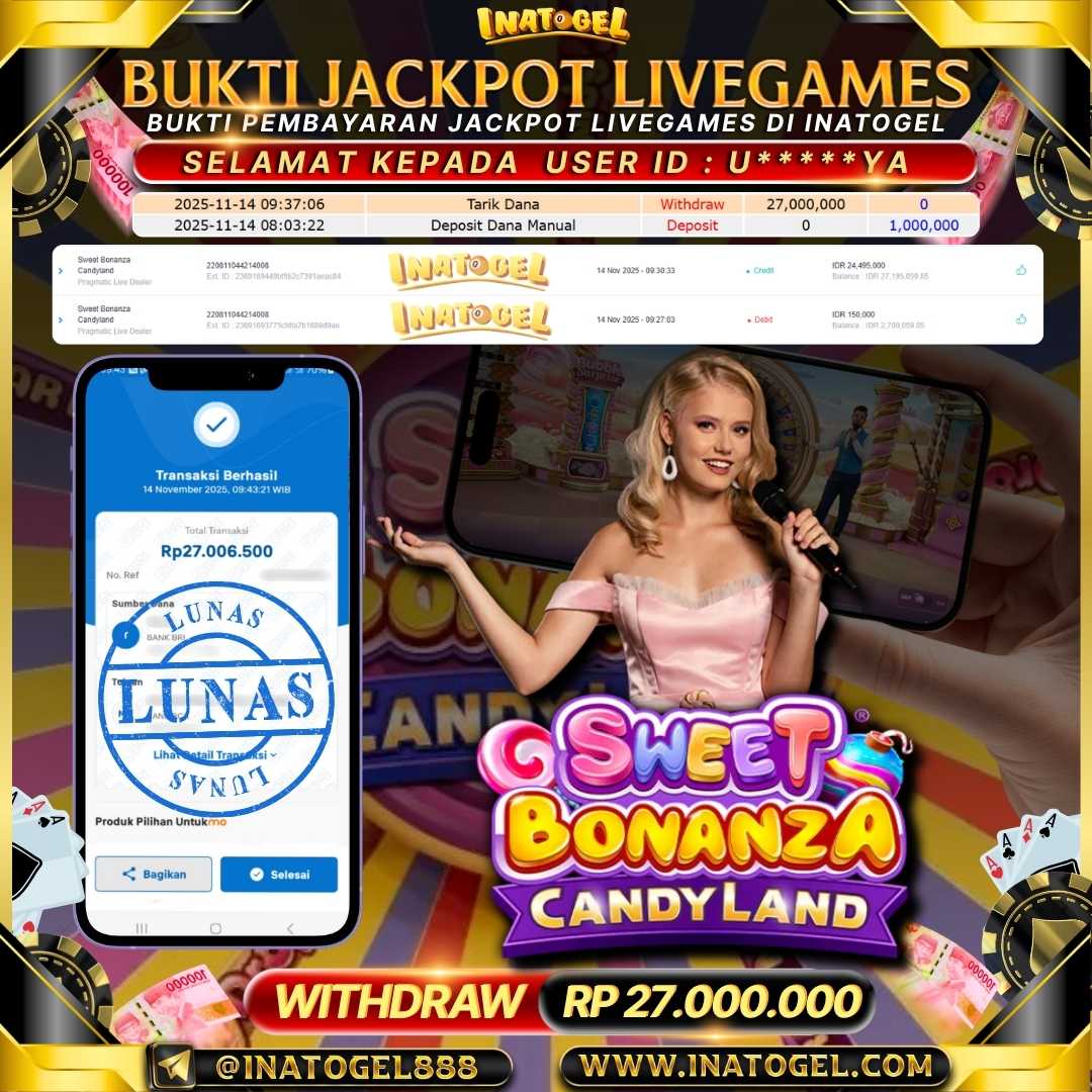 Selamat kepada User Id U******YA telah berhasil mendapatkan kemenangan jackpot pada permainan Live Games PP Live Sweet Bonanza Candyland Inatogel sebesar Rp27,000,000,- . Inatogel situs terpercaya sejak dulu hingga saat ini , Untuk kemenangan berapapun pasti akan kami bayarkan . Jangan ragu bermain di Ina Togel . Kami pihak Inatogel Menyampaikan terima kasih kepada seluruh member Ina Togel yang telah Percaya dan setia Bersama kami bermain di Inatogel hingga saat ini.
