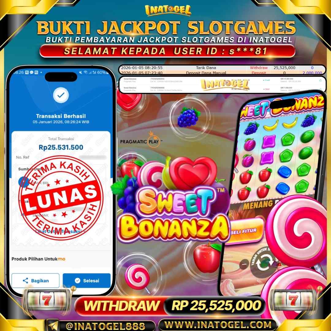 Selamat kepada User Id S***81 telah berhasil mendapatkan kemenangan jackpot pada permainan SlotGame Sweet Bonanza Inatogel sebesar Rp25,525,000,- . Inatogel situs terpercaya sejak dulu hingga saat ini , Untuk kemenangan berapapun pasti akan kami bayarkan . Jangan ragu bermain di Ina Togel . Kami pihak Inatogel Menyampaikan terima kasih kepada seluruh member Ina Togel yang telah Percaya dan setia Bersama kami bermain di Inatogel hingga saat ini.