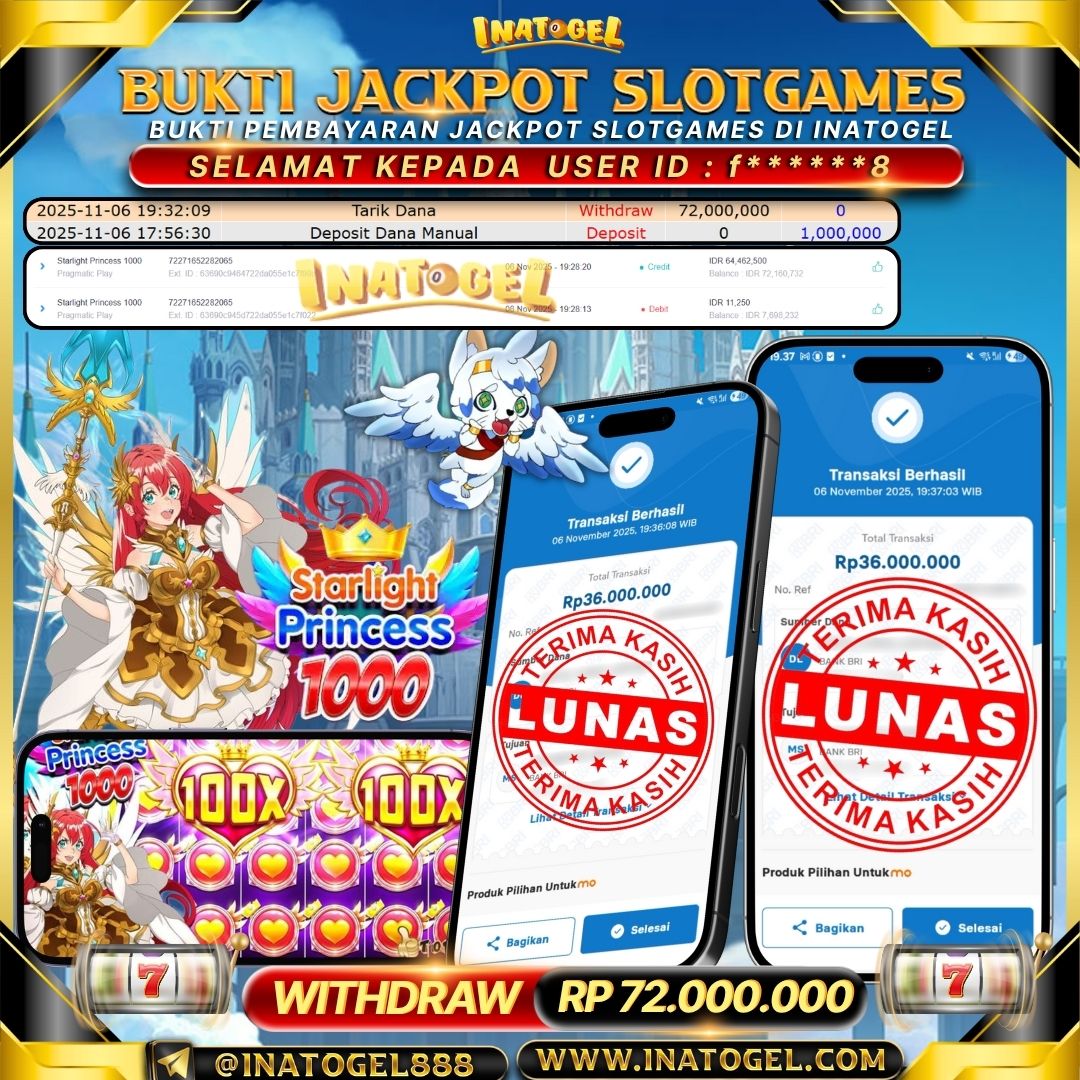 Selamat kepada User Id f*****8 telah berhasil mendapatkan kemenangan jackpot pada permainan SlotGame Starlight Princess 1000 sebesar Rp72,000,000,- . Inatogel situs terpercaya sejak dulu hingga saat ini , Untuk kemenangan berapapun pasti akan kami bayarkan . Jangan ragu bermain di Ina Togel . Kami pihak Inatogel Menyampaikan terima kasih kepada seluruh member Ina Togel yang telah Percaya dan setia Bersama kami bermain di Inatogel saat ini.