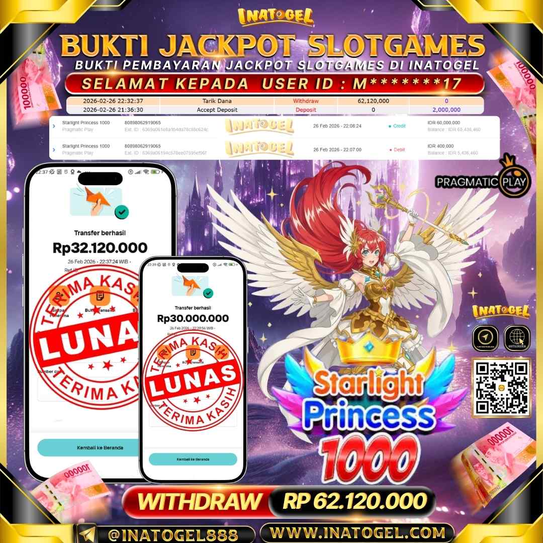 Selamat kepada User Id M*******17 telah berhasil mendapatkan kemenangan jackpot pada permainan Slot Games Starlight Princess 1000 sebesar Rp 62,120,000 Inatogel situs terpercaya sejak dulu hingga saat ini , Untuk kemenangan berapapun pasti akan kami bayarkan . Jangan ragu bermain di Ina Togel . Kami pihak Inatogel Menyampaikan terima kasih kepada seluruh member Ina Togel yang telah Percaya dan setia Bersama kami bermain di Inatogel saat ini.