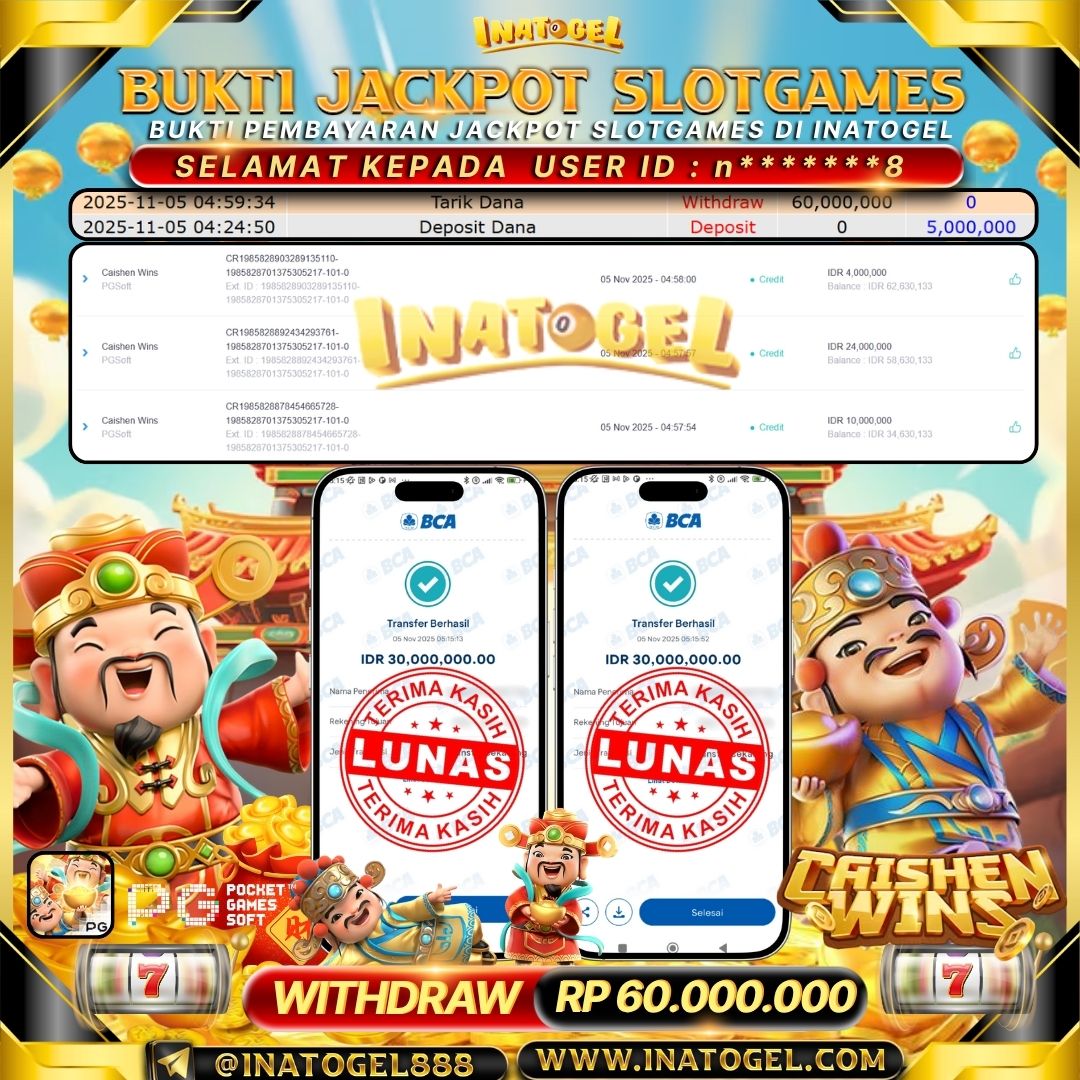 Selamat kepada User Id n*******8 telah berhasil mendapatkan kemenangan jackpot pada permainan SlotGame Caishen Wins sebesar Rp60,000,000,- . Inatogel situs terpercaya sejak dulu hingga saat ini , Untuk kemenangan berapapun pasti akan kami bayarkan . Jangan ragu bermain di Ina Togel . Kami pihak Inatogel Menyampaikan terima kasih kepada seluruh member Ina Togel yang telah Percaya dan setia Bersama kami bermain di Inatogel saat ini.