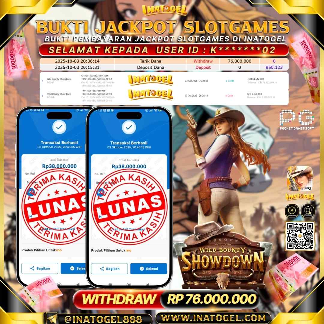 Selamat kepada User Id K*******02 telah berhasil mendapatkan kemenangan jackpot pada permainan SlotGame Wild Bounty Showdown Inatogel sebesar Rp76,000,000,- . Inatogel situs terpercaya sejak dulu hingga saat ini , Untuk kemenangan berapapun pasti akan kami bayarkan . Jangan ragu bermain di Ina Togel . Kami pihak Inatogel Menyampaikan terima kasih kepada seluruh member Ina Togel yang telah Percaya dan setia Bersama kami bermain di Inatogel hingga saat ini.